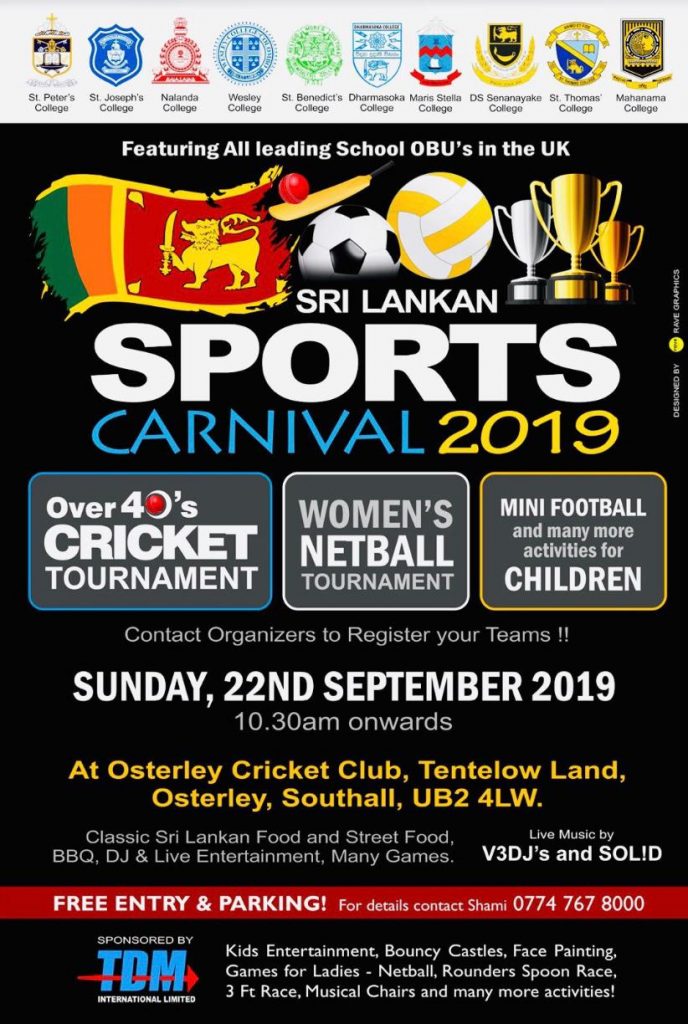 SportUK EVENTSUpcoming Events Sri lankan sports carnival in london August 17, 2019 FacebookTwitterPinterestWhatsApp